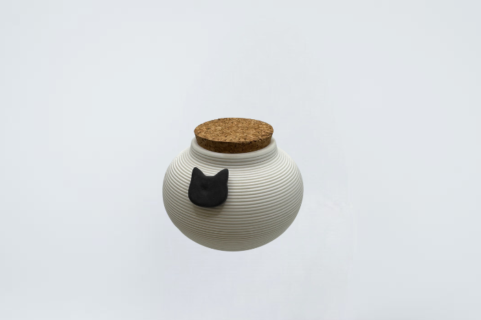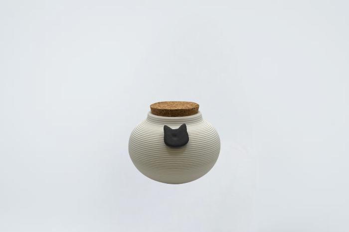A ceramic urn featuring a cork top, a black cat silhouette and a neutral textured surface.