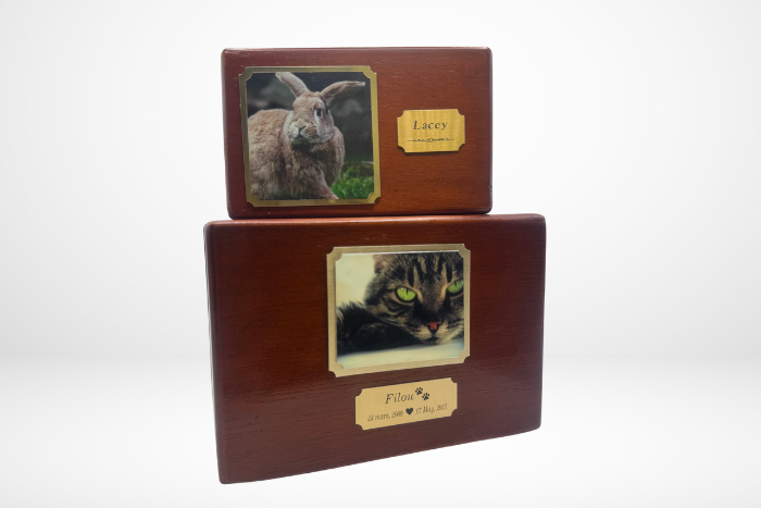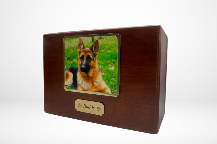 A mahogany wood urn with a sliding bottom to secure your pet’s ashes. It includes a metal plaque for photo transfer and an engraved name plaque (maximum of 3 lines).
